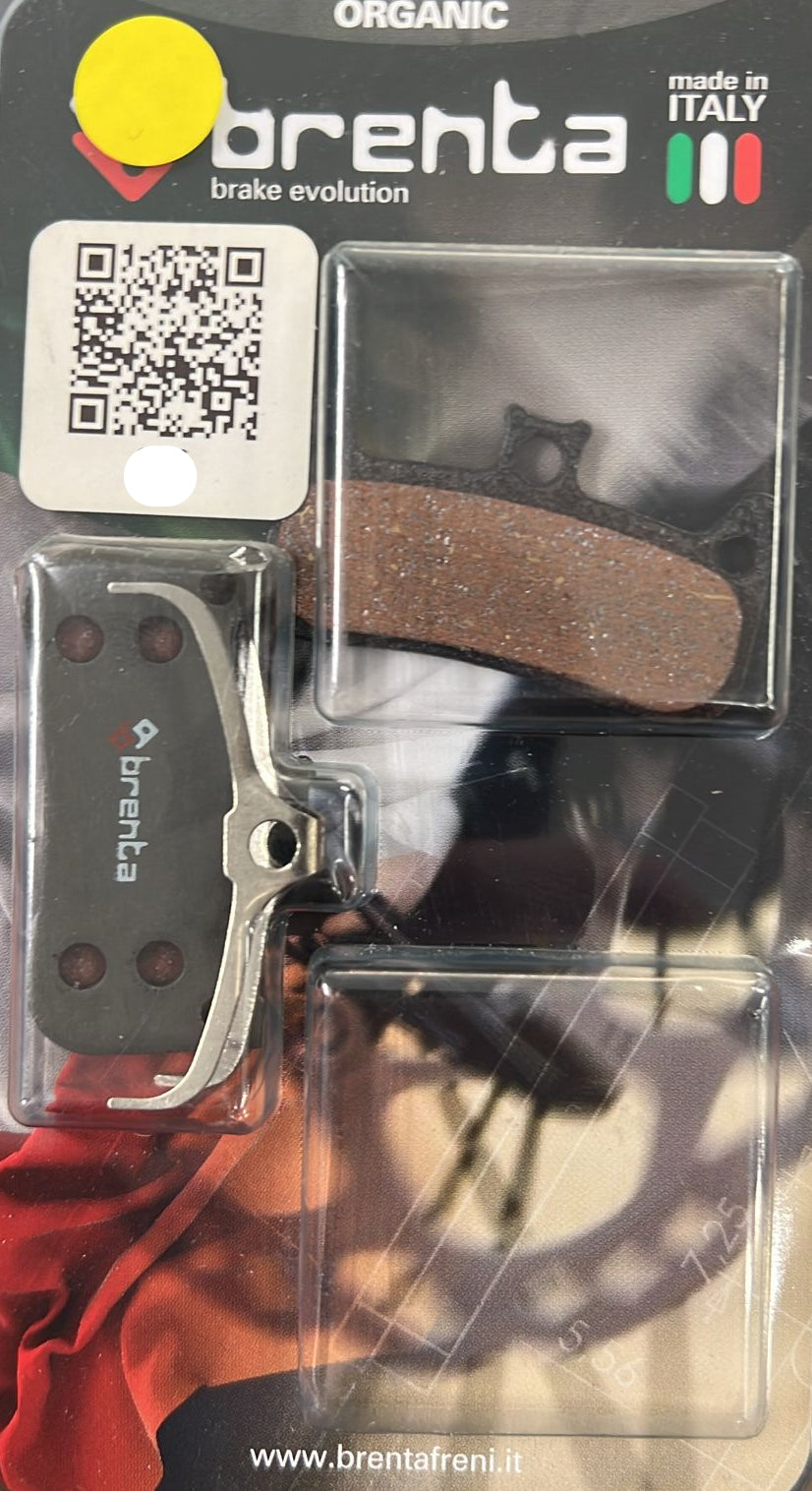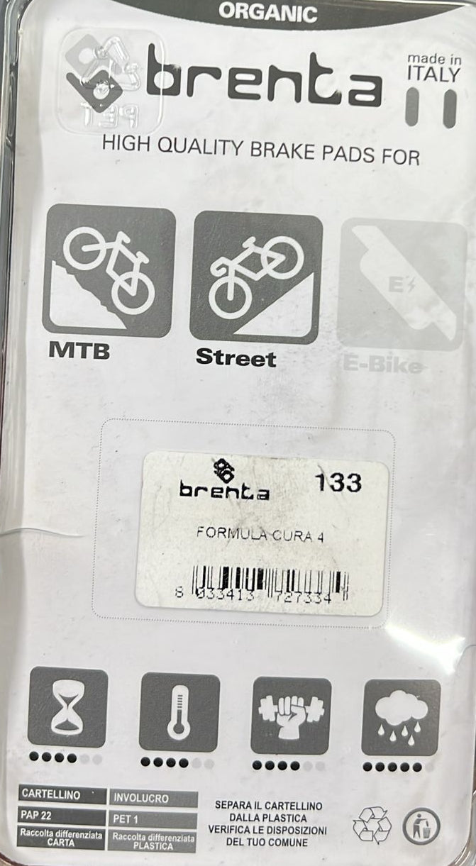 Pastiglie freno Brenta "Organic" (resina) compatibili con impianti Formula Cura 4. Mescola silenziosa e modulabile, ideale per uso MTB e urbano. Made in Italy.